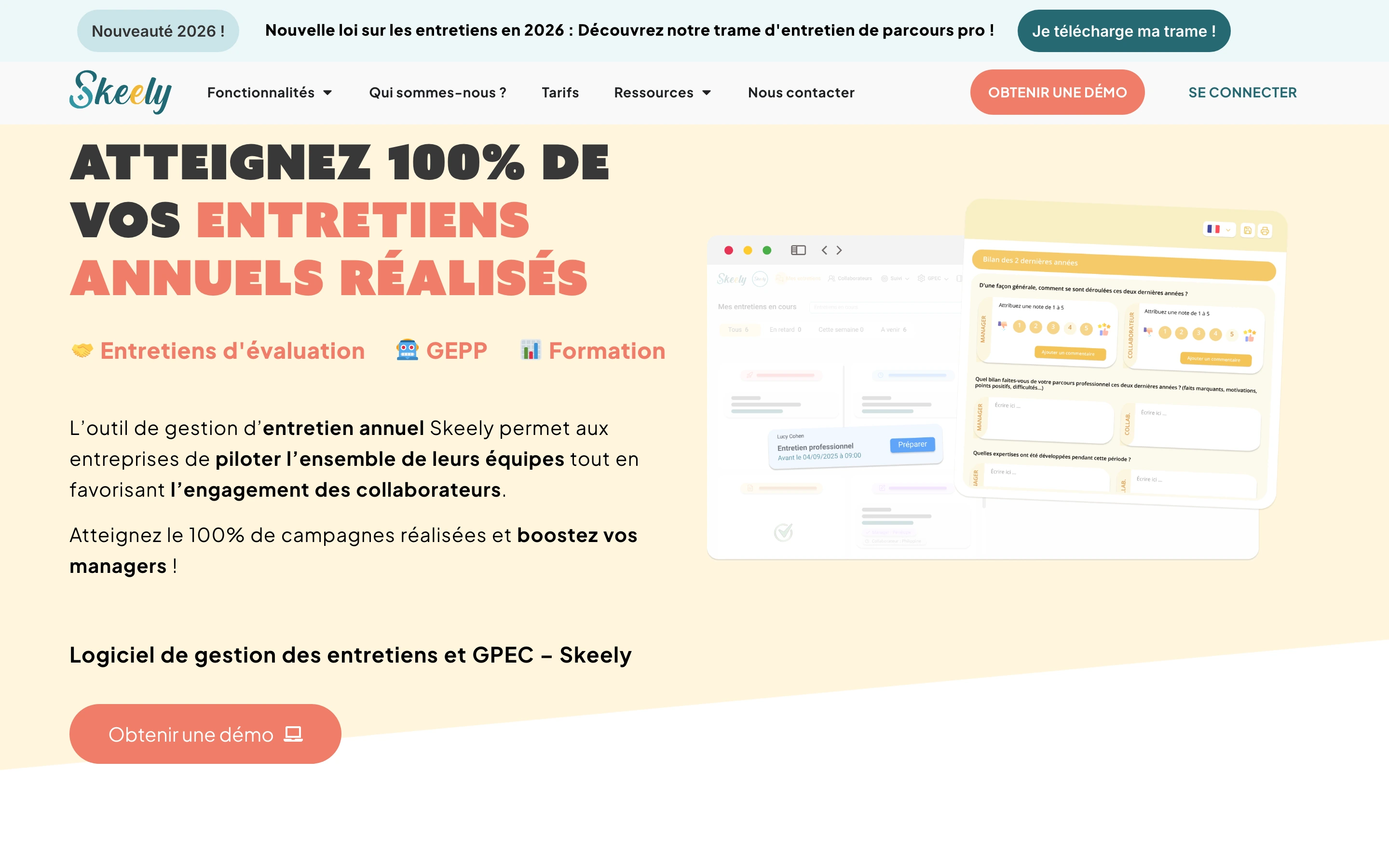 Vos besoins vont bouger : nouveaux entretiens, nouveaux référentiels, nouvelle politique de mobilité interne. Un bon logiciel doit vous permettre de créer et de modifier vos trames, vos campagnes et vos référentiels sans passer par l'éditeur. Testez la logique no-code ou low-code en démo.