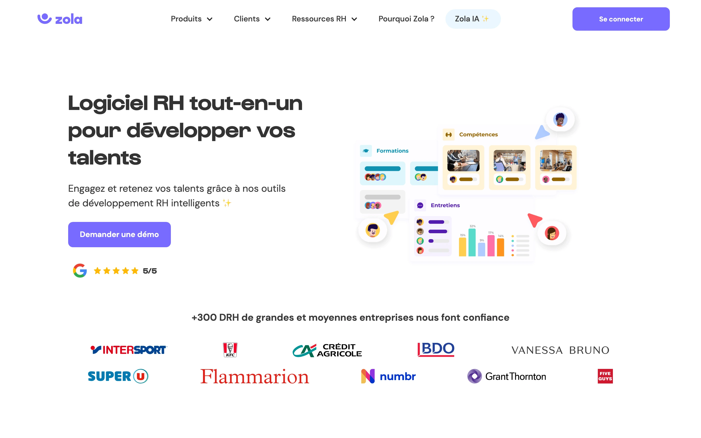 Zola est un logiciel RH tout-en-un pour développer vos talents. Enfin un outil de talent management pensé pour les PME et ETI, qui combine la profondeur fonctionnelle des grands éditeurs avec la simplicité d'un SaaS moderne. Plus de 300 DRH lui font confiance : Intersport, KFC, Crédit Agricole, BDO France, Grant Thornton, Vanessa Bruno, Super U, Flammarion, Legalstart, Celio.