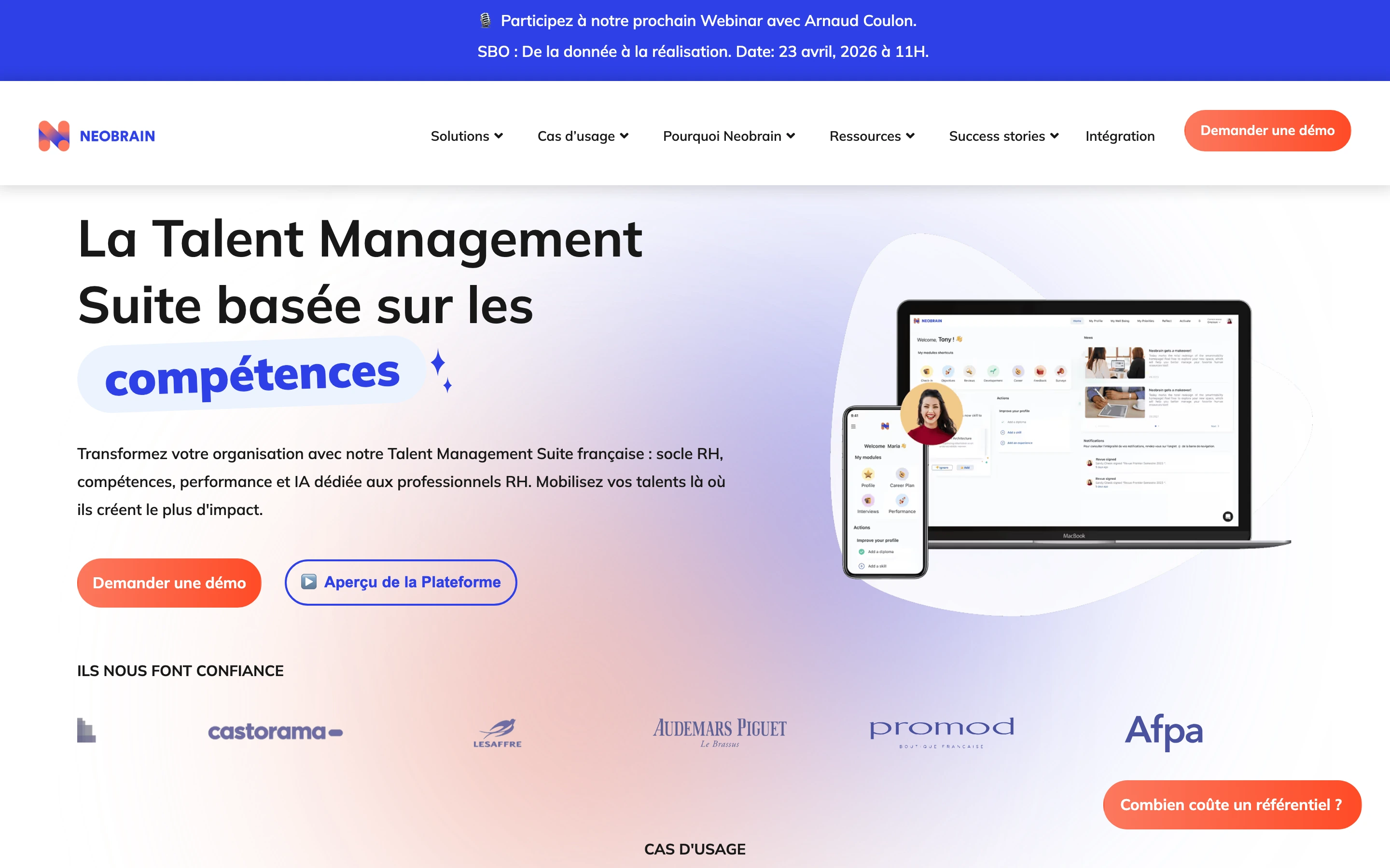 Neobrain est une plateforme française qui mise à fond sur l'IA pour analyser les compétences disponibles, identifier les écarts et prédire les besoins futurs en effectifs. L'outil recommande des postes adaptés aux profils des salariés et construit des modèles prévisionnels pour anticiper les évolutions du marché du travail.